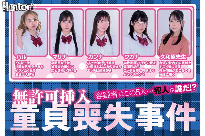 今回紹介する作品は、「無許可挿入童貞喪失事件『このクラスの女子の中に…本人の了承を得ず勝手に童貞を奪った犯人がいます!』疑われた女子たちはダンマリ決め込んで知らん顔。大好きな女子とのセックスのために大事に取っておいた童貞を睡眠薬で眠らされ奪われた男子。果たして犯人は誰なのか(配信品番:huntc00500)」だ!